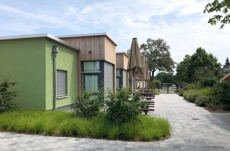 Der Neubau der integrativen Kita wird zum zukunftsweisenden Baustein am Bildungscampus Thallwitz. Dabei nutzt die Kita die vorhandenen Potenziale der Schul- und Sporteinrichtungen. Neben der Förderung der Nachhaltigkeit des gesamten Standorts wie z.B. der Niederschlagswasserversickerung des Neubaus als auch bestehender Dachflächen werden vorhandene Grün- und Spielstrukturen im Hinblick auf eine umweltbewusste Bildung weiterentwickelt. Während die gebäudenahen Bereiche als Terrassen befestigt sind, zeichnen sich die übrigen Freiflächen durch vielfältige Spielangebote und abwechslungsreiche Geländemodellierungen mit integriertem Grünen Klassenzimmer aus. Die Freianlagen enthalten eine vielfältige Anzahl an heimischen Obstbaumsorten. Den Kindern sollen so die verschiedenen Blüte- und Fruchtzeiten im Jahresverlauf nähergebracht werden.