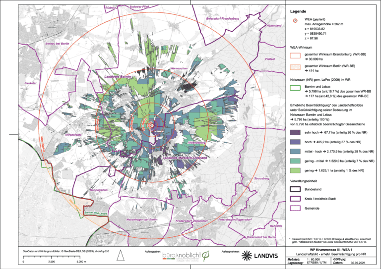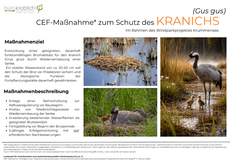 Im Vorfeld der Planung wurde das Projekt umfassend ökologisch untersucht. Hierzu erfolgten detaillierte fachgutachterliche Prüfungen zu Landschaftsbild, Artenschutz sowie zu vorkommenden Vogel- und Fledermausarten. Auch eine gezielte Erfassung des Rotmilans wurde durchgeführt. Die Ergebnisse wurden in entsprechenden Fachbeiträgen und Gutachten dokumentiert und in die Planung integriert. Zur Sicherstellung der artenschutzrechtlichen Anforderungen wurde zudem eine vorgezogene Ausgleichsmaßnahme (CEF-Maßnahme) zum Schutz des Kranichs umgesetzt. Ziel dieser Maßnahme war die Entwicklung eines geeigneten Bruthabitats durch habitatverbessernde Maßnahmen und Wiedervernässung, um die ökologische Funktion der Fortpflanzungsstätte dauerhaft zu gewährleisten. Die Wirksamkeit wird im Rahmen eines fünfjährigen Erfolgsmonitorings überprüft und fachlich begleitet.